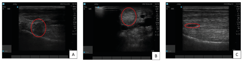 Figure 2. Case one’s proximal branch of the suspensory ligament ultrasound imaging : A) Longitudinal section, three months after PRP treatment,. In red circle, a hypoechogenic zone which is the sign of the ligament’s lesion. B) Transversal section, six weeks after second tendon-derived mesenchymal stem cells injection. In this image, the red circle is on the hyperechogenic zone. C) Longitudinal section, four months after tendon-derived mesenchymal stem cells second injection. This one, show a homogenous and linear organisation but in the red circle, a little hypoechogenic zone persists