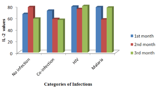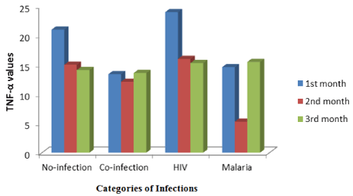 From figure 1, the levels of TNF-α is high (30.0 ´ 10-3 pg/µL) in non-infected babies at delivery whereas IL-2, IL-10 and IFN-γ peaked at (70 ´ 10-3 pg/µL, 40´ 10-3 pg/µL) and 16.0 ´ 10-3 pg/µL respectively in uninfected babies. At delivery, the levels of TNF-α, IL-2, IL-10 and IFN-γ was 18.3 ´ 10-3 pg/µL, 69.8 ´ 10-3 pg/µL, 41.0 ´ 10-3 pg/µL and rise to 28.3 ´ 10-3 pg/µL in co-infected babies. Figure 5 showed that TNF-α decreased progressively in uninfected and HIV infected post-delivery babies. IL-2 levels increased in the second month in no-infection categories of babies. In co-infected babies, there was a progressive decrease in the cytokine levels as indicated in figure 2. The level of IL-10 was highest in co-infected babies at the second month post-delivery (Figure 3). Figure 2 showed progressive increase in the level of IFN-γ at the third month among the un-infected, co-infected and seropositive babies.