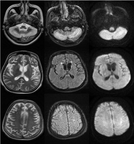 Figure 2. T2w,T2 sagittal, T2 flair brain imaging; Edema and thickening due to involvement in cortical gray matter areas of cerebellum,basal ganglia,frontal and parietal lobe.Diffusion images in the same regions of diffusion restriction
