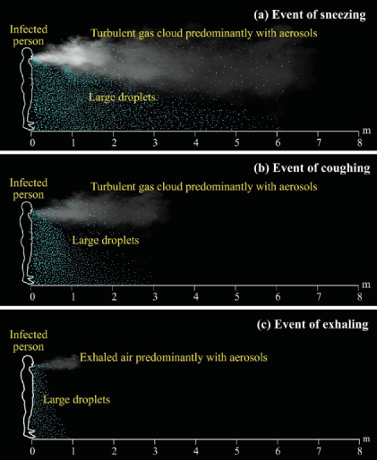 Figure 1. Trajectories of droplets and aerosols from an infected patient (a) event of sneezing with droplets travelled for 6m at a speed of 50m/s within 0.12s (b) event of coughing with droplets travelled for 2m at a speed of 10m/s within 0.2s (c) event of exhaling with droplets travelled for 1m at a speed of 1m/s within 1s [49].