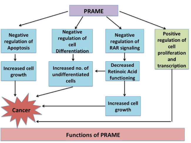 Since PRAME is a dominant repressor of RAR signalling. It prevents ligand-induced receptor activation upon binding to RAR in the presence of RA. Thus, cancer cells over expressing PRAME acquire a survival advantage and are able to escape from RA-induced cell growth arrest. Thus, PRAME confers growth or survival advantages and promotes malignant differentiation of stem cells [44].