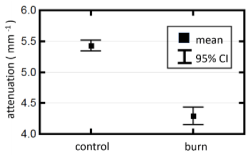 Figure 3 shows the average attenuation coefficients measured at all control and all burn sites over the full post-burn period (0 to 3 h). There was a statistically significant difference between the attenuation coefficients measured at the control and burn sites.