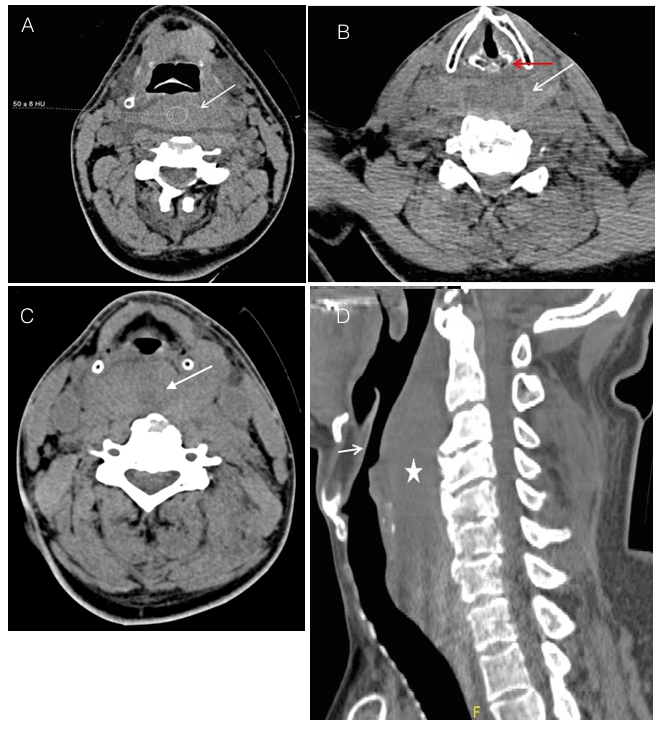 Figure 1. A. Axial unenhanced CT neck at the level of the epiglottis shows prevertebral/retropharyngeal high density (ROI density of 50 +- 8 Hounsfield Unit, white arrow) signifying hematoma.