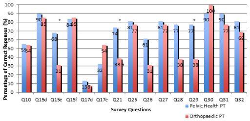 Results: Seventy-eight individuals responded, 44 were included in the study (31 pelvic health, 13 orthopaedic). Pelvic health PTs had increased awareness regarding CPGs compared to orthopaedic PTs (74% vs. 38.5%, p<0.05), selected correct pain terminology (77% vs. 38%, p<0.05), and correctly found age as non-risk for PPGP (68% vs. 31%, p<0.05). This did not translate to clinical practice, as both groups selected management strategies incongruent with PPGP CPGs.