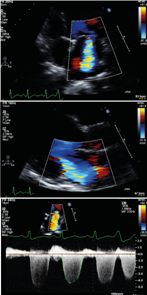 Figure 2. Echocardiography with Color-Doppler showing moderate-severe mitral regurgitation