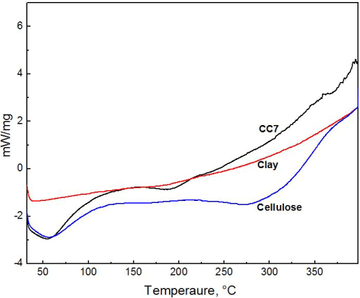 Figure 4. DSC thermogram of composite CC7, modified clay and crystalline cellulose.