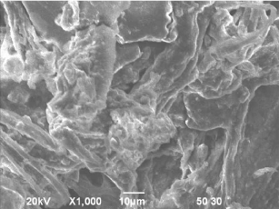 Scanning electron microscopy (SEM) images of different composition of composites show significant difference in morphology of composites. The stark contrast between crystalline cellulose, modified clay, composite CC1 and CC7 are clearly visible from their SEM images at 1000× magnification. (Figure 5A, 5B, 5C, 5D).