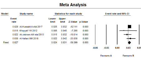 Analysis of data was performed using statistical package for social science (IBM SPSS Inc), Version 20, Chicago; and by using the Comprehensive Meta-analysis program (CMA), Version 3. software program (Biostat, USA). Heterogeneity was calculated using I squared (I2). I2 values of 0%, <25%, 25% to 49% and > 50% denoted no, low, moderate, and high heterogeneity, respectively. The results were illustrated in tabulated form, diagrams and figures.