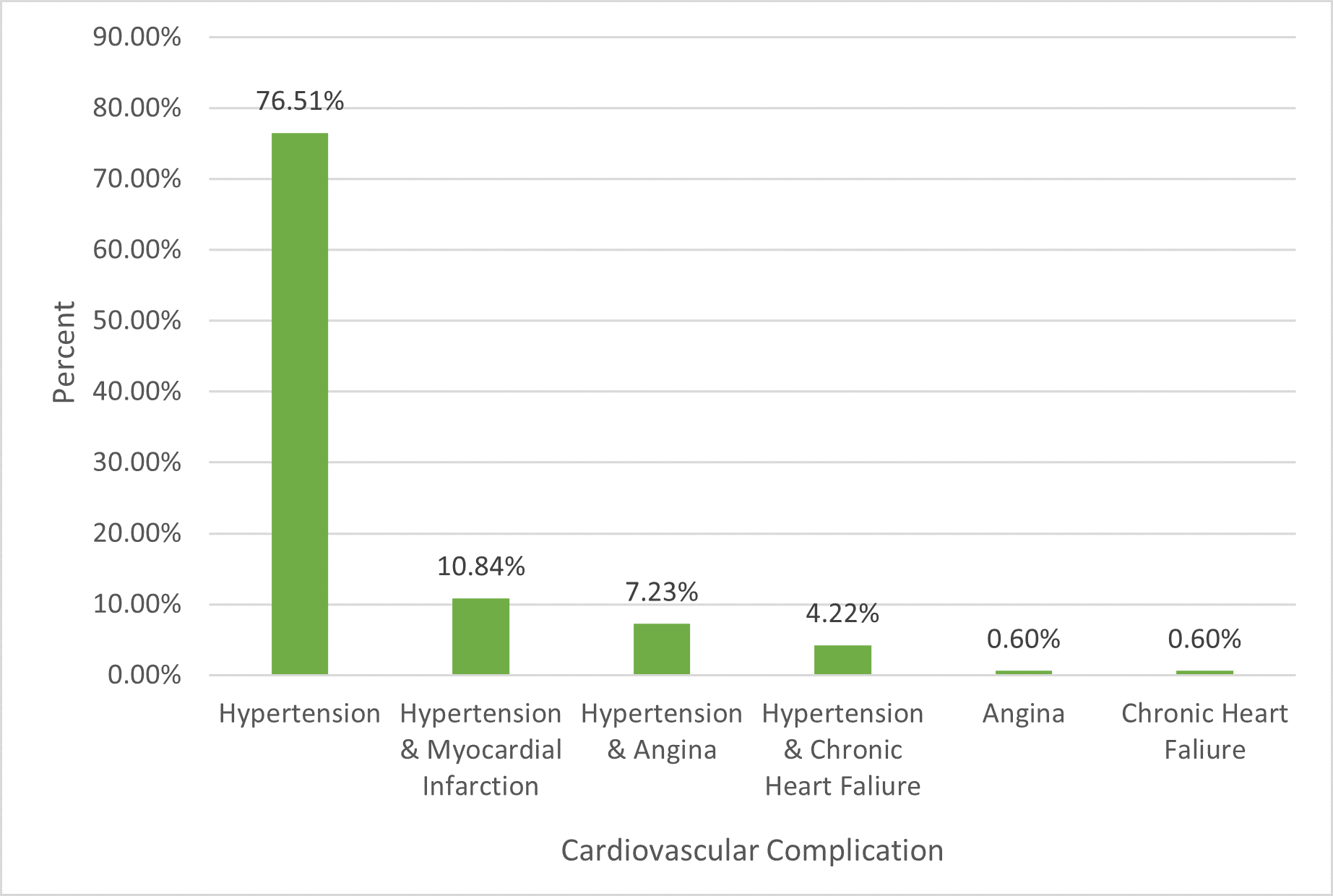 The prevalence of diabetic Coronary heart disease among type 2 diabetes patients is 24.1% [14]. Cardiovascular complication like hypertension, angina, chronic heart failure and myocardial infarction, increase the risk of death 2-3 times compared with diabetic patients without it [14]. Cardiovascular complications share some risk factors with diabetes include smoking, hypertension, hypercholesterolemia and obesity [14].