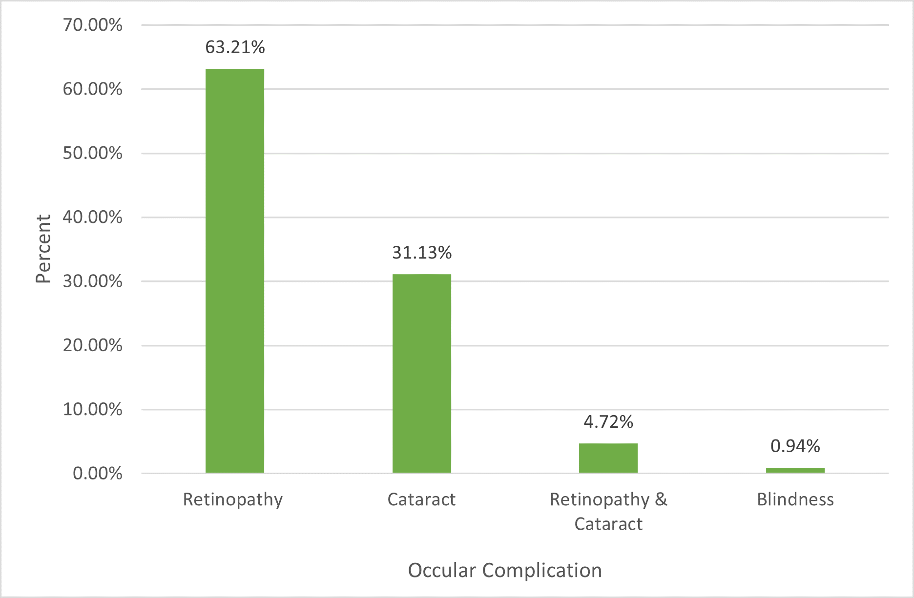 The prevalence of diabetic retinopathy is 34.6% [20]. As a result of long-standing uncontrolled diabetes, the patient may develop an ocular complication diabetic retinopathy includes a blurring of vision, cataract and glaucoma [1]. Diabetes considers as the leading cause of adult blindness [21].
