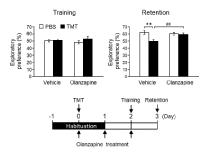 Mice were intraperitoneally injected with either PBS or TMT (2.6 mg/kg). Olanzapine (0.6 mg/kg) or vehicle (saline) was intraperitoneally injected into the mice at 30 min, 24 h, and 48 h after TMT injection (lower panel). The left graph denotes the exploratory preference for one object in the training session of the novel object recognition test. The right graph denotes the exploratory preference for the novel object in the retention session of the novel object recognition test. Data are expressed mean ± SEM (n = 14). **P < 0.01, significantly different between each value obtained for animals treated with PBS or TMT. ##P < 0.01, significantly different between each value obtained for animals treated with vehicle or olanzapine.
