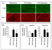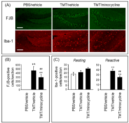 To elucidate the involvement of reactive microglia in TMT-induced neurodegeneration, the effect of minocycline, an inhibitor of microglial activation, on TMT-induced neurodegeneration and microglial activation (Figure 3) was assessed. As expected, minocycline decreased the number of reactive Iba-1-positive cells in TMT-treated animals (Figure 3A & 3C). In addition, minocycline significantly decreased the number of FJB-positive cells generated by TMT (Figure 3A & 3B). These data suggest that inhibition of microglial activation served to suppress TMT-induced neurodegeneration in the dentate gyrus.