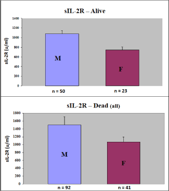 Figure 2b. We demonstrated a significant higher distribution of sIL-2R in male patients, as compared to females. This was correct for all individual markers, we showed it here only for sIL-2R, as an example of the Tumor Markers.