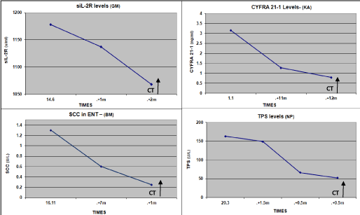 Figure 5. Kinetics of Tumor Markers in HNC patients responding to therapy, which decreased significantly. (1-12 m before indicated by CT).