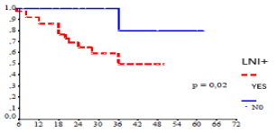 Regarding the location of the tumor, the distal location was observed in half of the cases, and the survival was not influenced by the location of the tumor. A meta-analysis with a systematic review of the literature [10] including 50 studies concluded that localization in the upper third of the stomach was associated with a poor prognosis (p<0.001), and after excluding tumors from the gastroesophageal junction, the prognosis was bad for the tumors of the cardia. Several authors also identified tumor size as a predictor of survival and proposed to include tumor size in the UICC TNM classification to improve survival prediction in patients undergoing curative resection. A recent study [11] showed that tumor size was a critical factor in the indication of adjuvant chemotherapy for T3-4aN0M0 tumors. This study concluded that tumor size was an independent prognostic factor. In addition, adjuvant chemotherapy improved the prognosis in patients with T3-4aN0M0 gastric cancer with tumors greater than 5 cm, whereas these results were not found for tumors smaller than 5 cm. Although this study had its limitations; retrospective study with small sample size, further trials are needed to validate its findings. In this study tumor size had not influenced overall survival. Regarding the histological type, several histological classification systems for gastric cancers were described and there is still controversial as to which classification gives a better prognostic correlation. The World Health Organization (WHO) classification published in 2010 appears to be the most detailed of all histological classification systems and is considered an independent prognostic factor [12]. Most authors attributed a poor prognosis to signet-ring cell carcinoma compared to other histological types. The presence of signet-ring cell had significantly influenced the overall survival of our patients (p=0.0009) (Figure 2). In addition, the undifferentiated forms and the mucinous type had a poor prognosis compared to the papillary and tubular types [12]. The presence of lymphatic and/or blood vessel invasion (LBVI) is considered as an independent factor of poor prognosis for N0 tumors and lymph node recurrence is more common in LBVI + tumors [13]. The same study showed that patients with pT3N0 tumor or patients with N0 tumor who had lymph node dissection less than D2 can benefit from adjuvant chemotherapy if histopathological examination found LBVI, and according to authors, patients who were initially treated by endoscopic resection and in whom LBVI were identified on the resection specimen, these patients should be referred secondarily to surgery for gastrectomy with complementary lymph node dissection. The degree of parietal invasion also significantly influenced the prognosis of gastric adenocarcinoma. Overall, survival is better for poorly evolved tumors (T1, T2) compared to advanced tumors (T3, T4) [14]. Lymph node (N) status is recognized as the most important factor conditioning the prognosis of gastric adenocarcinoma especially for untreated forms of cancer [15,16]. Indeed, the overall survival rate increases from 90-70% respectively in the absence and in the presence of lymph node metastases [16]. Lymph node invasion was observed in 70% of our patients and significantly reduced survival (p=0.02) (Figure 3).