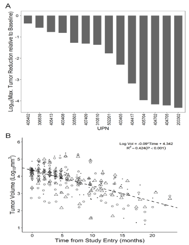 Figure 3. Imaging Responses in R/R AA (WHO Grade 3) Patients Treated with OT101 Monotherapy Who Achieved a CR or PR. [A] A waterfall plot depicting the maximum log10 reduction values for the tumor volumes. [B] A semi-log plot of the combined 3-D tumor volume reduction curve for the 14 patients with a CR or PR. The first order kinetics of the tumor volume reduction for the entire population of the 14 objective responders is illustrated by fitting a straight line to a semi-log plot of the portion of the tumor reduction curve that displayed maximum reduction in tumor size over the course of OT101 treatment. Data points represent the individual assessments from 2-3 radiologists for each time point of MRI assessment for each of the 14 patients