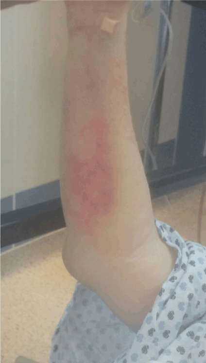 Three day later the patient had a better general condition, was conscious, with erythema limited to forearms, face and perineum, the lowers limb had no edema and she was better hydrated.