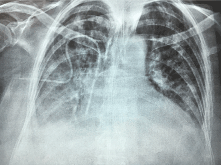 Figure 5. The chest X-ray shows right basal opacity, with atelectasis lines.