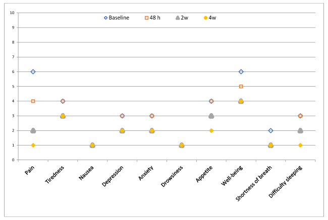 Although there are numerous validated methods for symptom assessment, it is important to choose the one that is simplest, most comprehensive and useful in clinical practice [27]. In the study, we selected the 10-symptom ESAS, which encompasses the main symptoms experienced by cancer patients. The analog scales used in it make it easy to identify if each symptom is controlled, with no need for any calculation. The improvement that is defined as clinically significant for the 10-point VAS is 1.2 points (95% CI 9-1.5), allowing it to be assessed whether the change from the previous state is adequate [24]. It is used in many clinical studies, so the results can be compared to those of other centers, and its use is free.