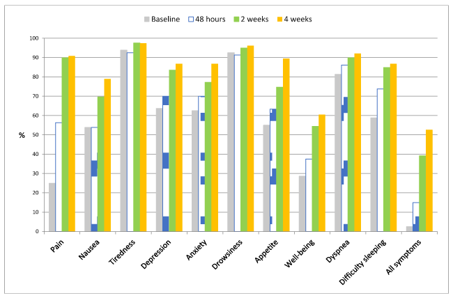 Control of all other symptoms improved significantly, with an increase in pain control, nausea and lack of appetite that was already significant at 48 hours (p<0.001), whereas control of depression, anxiety, malaise and difficulty sleeping improved after two weeks (p<0.01). Malaise was the symptom that was worst controlled, only in 60% of patients (Figure 2).