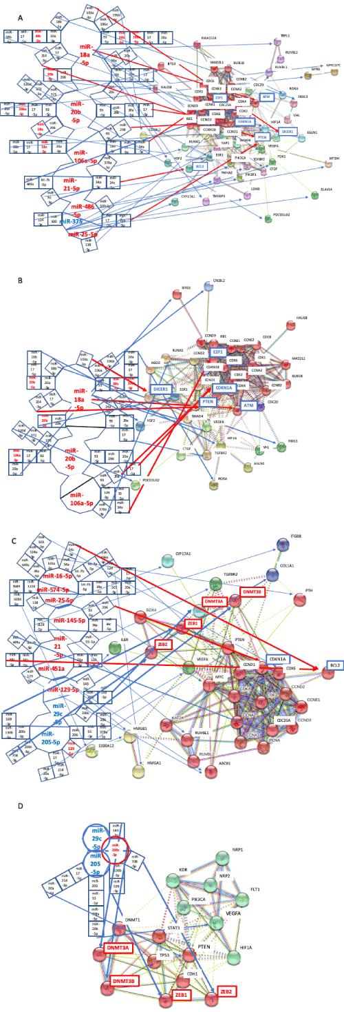 Figure 4. METS simulation of ESCC. The results of METS simulation were represented as (A) ESCC in the stage of 0-I of all QCRs, (B) ESCC in the stage of 0-I of the miRNA hub, (C) ESCC in the stage of I-IV of all QCRs and (D) ESCC in the stage of I-IV of the miRNA hub. miRNAs: upregulation, red; downregulation, blue. Proteins: augmentation, red; suppression, blue.