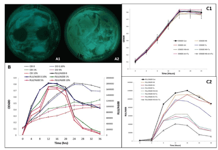 Figure 1. Zones of inhibition observed around discs soaked in 10% Holy basil aqueous extract (A1) in comparison with the control (A2) after 22 h of growth period. Effects of different concentrations of Holy Basil extract (0, 0.1, 1.0, 5.0 and 10.0%) on V. fischeri growth (OD600) and luminescence over time (B). Effect of possible combinations of Holy Basil (HB) Artemisia (Art) and Turmeric (Tu) at their lowest concentration (0.1%) on the growth (C1) and luminescence (C2) of V. fischeri over 24 h. Bars represent the mean of three replications plus and minus the standard error of the mean