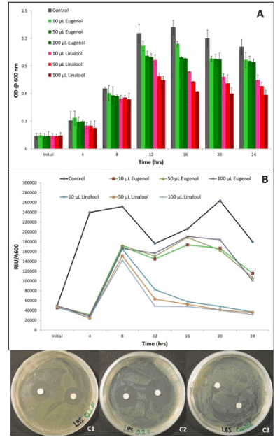 Figure 2. Effect of various concentrations (0, 10, 50, 100 µL) of volatile compounds, eugenol and linalool on optical density (A) and luminescence (B) of V. fischeri a 24 h period. Zones of inhibition observed after 22 h of growth around discs soaked in 0.1 µL (C1) and 0.2 µL (C2) of linalool in comparison with the control (C3). Bars represent the mean of three replications plus and minus the standard error of the mean