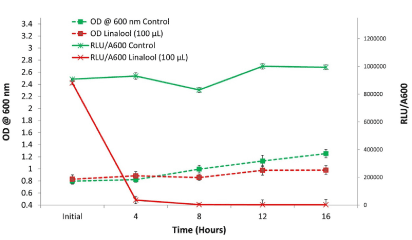 Figure 4. Volatile effect of linalool (100 µL) on fully grown V. fischeri bacteria without contact compared to control over a 16 h period. Bars represent the mean of three replications plus and minus the standard error of the mean