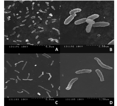 Figure 5. SEM images of V. fischeri – untreated (A & B) and treated with linalool 50 µM (C & D) without direct contact in liquid bacterial culture