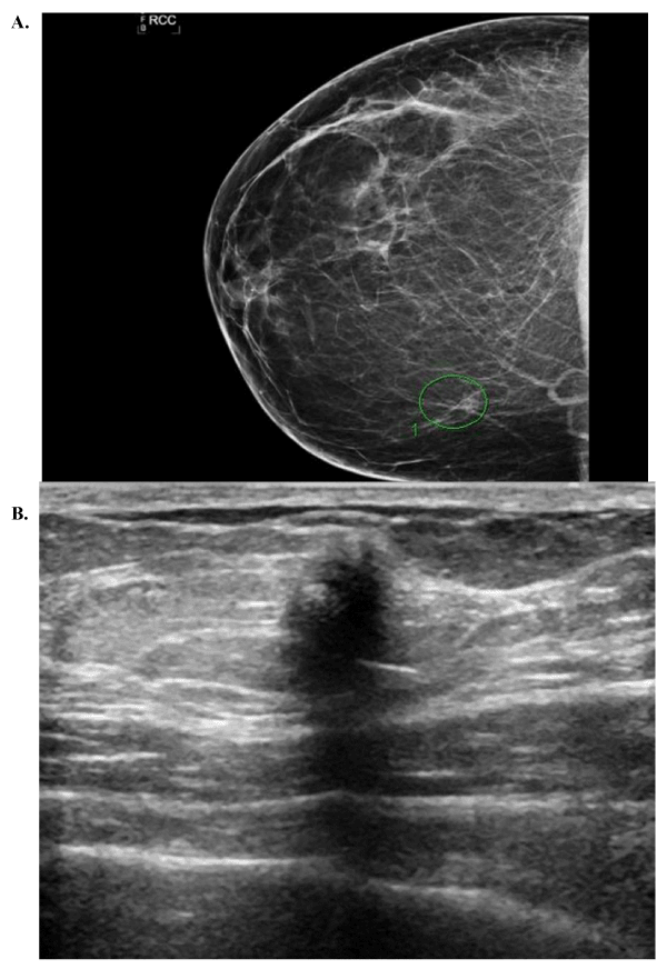 Figure 1. (A) Mammogram depicting mass without calcifications, (B) Ultrasound of a breast mass with spiculated margins and posterior acoustic shadowing