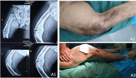 Figure 1. A1. the X-ray film of right femoral shaft before admission; A2-3. appearance of right lower limb before operation