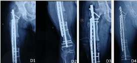 Figure 4. D1-2. the X-ray films of femur were reexamined after replacement of internal fixation materials; D3-4. the X-ray films of femur were reexamined after 4 weeks of replacement of internal fixation materials
