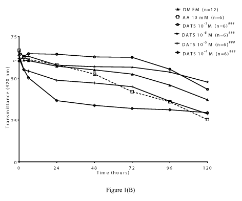 DATS: The polysulfides, DADS, DATS, and SAC have been shown to release H2S in both in vivo and in vitro systems [5-6,32]. Among these polysulfides, DATS was reported to exhibit a superior ability to releasing H2S in biological media [6]. In the present study, we examined the pharmacological actions of different concentrations of DATS in protecting lenses from time-dependent loss of lens transparency. The lower concentrations of DATS (10-7 M and 10-6 M) attenuated time-dependent decrease in transmittance up to 120 hours. Both concentrations of DATS significantly (p<0.001; n=6) increased transmittance by 16.91 ± 0.01% and 28.54 ±0.15% respectively at 120 hours (Figures 1A). In contrast, the higher concentrations of DATS tested (10-5 M and 10-4 M) did not protect lenses from the time-dependent loss in transparency. The protective action of low concentrations of DATS (10-7 M and 10-6 M) was superior to that of the positive control, AA (10 mM), which was only effective up to 24 hours (Figures 1B). These observations were corroborated by optical clarity of lenses treated with DATS (10-7 M and 10-6 M) up to120 hours (Figure 1C).