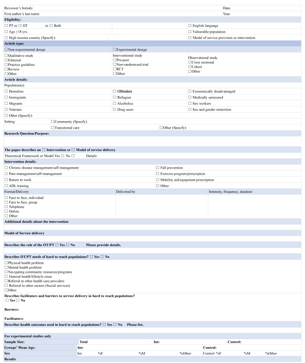 Proposed Eligibility Criteria: Articles published in the year 2000 or later will be included to ensure that the literature reviewed is relevant to the current environment and the status of physiotherapy and occupational therapy resources for hard to reach populations. In addition, only articles published in English will be considered.