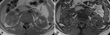 Figure 2. a: On T1-weighted gradient-echo in-phase imaging the lesions show high signal. b: On opposed-phase gradient-echo images the lesions reveal signal loss due to the presence of fat, as found in Angiomyolipomas.