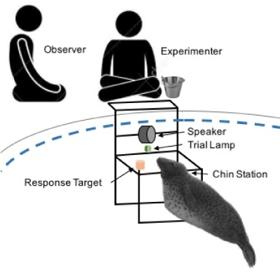 Prior to the start of a trial, the subject was asked to ‘station’ by both a vocal and hand cue: they would then dive to an underwater station, 75 cm below the surface, and place their chin onto the chin-plate. The station was located 50 cm in front of an underwater loudspeaker (UW-30, Electro-Voice, Buchanan Michigan, USA; 20 cm) and a trial signalling light (Figure 1). The trial began when the light turned on, signalling that an auditory tone may/may not follow. The frequency and duration of stimulus was maintained for an entire research session, however, the intensity of the signal changed from one trial to another as the animal continued to respond correctly (See ‘method of limits’: Levitt, 1971; Gescheider, 1997, Chapter 3). Two types of trials were used in this testing procedure: (1) signal present (GO) and (2) signal absent (NOGO). The order in which the trials were presented to the animal were randomized using 12 pre-made trial sequences construced by a Matlab program, using [24] rules for an ‘appropriate’ randomization of psychophysical trials. The Gellerman rules are that the number of stimuli should remain the same to avoid stimulus bias, and that the stimulus is not presented more than three times in a row. The initially completely random schedule was adjusted so that there were never more than three trials in a row of either GO or NOGO trials. For a correct GO trial, the seal would leave the station upon the presentation of an audio signal and touch a red response target to the left of the station with its nose. For a correct NOGO trial, the seal would remain stationed until the trial light was turned off. After each correct response, a bridge was emitted from the underwater speaker, followed by the seal returning to the surface where the trainer would hand feed the fish reward, to ensure that the animal could distinguish between the trial tones and the bridge, the bridge was a 6-kHz broadband tone. The number and type of fish that the seal received varied between the individuals, but the quantity and type of fish remained constant between trials for an entire research session. For incorrect responses, the animal was not bridged and did not receive a fish reward. He was then asked to re-station for the start of the next trial. A ‘time out’ situation was only used if an animal left the station 3-4 times in a row, and lasted 10-15 seconds. The inter-trial interval was attempted to be kept short, but was elongated if an animal left station to swim the pool or played with the fish they had received for reinforcement. Each research session lasted approximately 12-15 minutes. At the start of each session, each animal had a certain number of trials to complete for that session with no time limit to complete that task. Research sessions were conducted once per day, five times per week. These sessions were primarily conducted as the first session of the day, where one animal would be worked at 9 AM and the second animal would then be worked at 9:30 AM.