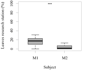 Figure 2. Number of times (%) that each animal left the research station (greater than a 0.5 m radius) after each trial (N = 27 trials/session for M1; N = 31 trials/session for M2; SD= -3.36; *** indicates p < 0.001, ** indicates p < 0.01, * indicates p < 0.05).