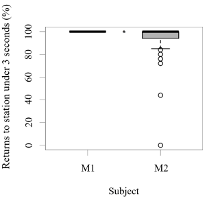 Figure 3. Number of times (%) that each animal remained around the research station (less than a 0.5 m radius) and returned to station in a time span less than three seconds after each trial (N = 27 trials/session for M1; N = 31 trials/session for M2; SD= -3.36; *** indicates p < 0.001, ** indicates p < 0.01, * indicates p < 0.05).