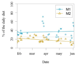 Figure 6. Percentage of the daily diet used as reinforcement per research session for each animal. Coloured lines are derived from the linear model (SD= -17,94). The grey dashed line is situated at the value 25%, as this represents the amount of food they would receive in a regular training