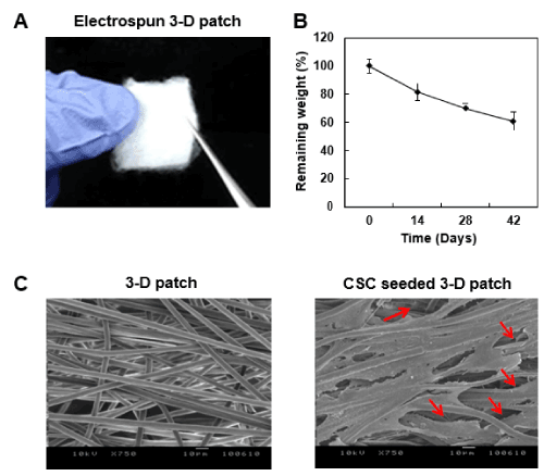 Figure 1. Morphological features of the 3-D fibrous patch for cardiac stem cells engraftment. (A) Optical image of the 3-D fibrous patch. The patch is composed of unbound PLLA fibers made by electrospinning process, which is expanded for suitable appliance onto the injured myocardium. (B) In vitro degradation profile of the 3-D patch. Changes in weight were measured after 0, 14, 28, 42 days of immersion in PBS (pH 7.4) with mild agitation (30 rpm) at 37 °C. The assay was quadruplicated. (n=4) (C) Representative SEM image of PLLA 3-D patch and cardiac stem cell (CSC)-seeded patch a day after culture in growth media. The cells were well-infiltrated throughout the fibrous structure of the 3-D patch (red arrows) in addition to directionality of the bound cells in aligned fibrous structure of the mat. Scale bar=10 μm.