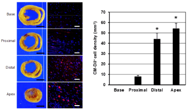 Figure 4. The topographic distribution of the CM-DiI+ cells in the different parts of heart and the quantitative analysis. Epicardially implanted CSCs were dominantly migrated into the injured myocardium (distal and apex). CM-DiI+ CSCs were not detected in the spared myocardium at the base and occasionally observed in the proximal area. (Scale bar=3 mm (left) and 200 μm (right). *, p<0.01 compared with proximal or base).