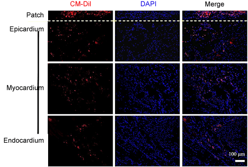 Figure 5. Homing ability and engraftment of epicardially implanted CSCs into the infarcted myocardium. Representative microphotographs of heart sections. CM-DiI labeled CSCs were observed at epicardium 2 week after implantation. Implanted CSCs via the 3-D patch were migrated into the inner part of myocardium (endocardium) from the adjacent area of implantation. (Scale bar=100 μm).