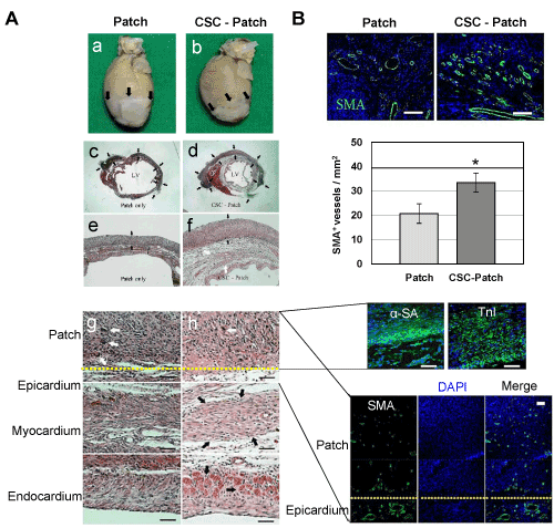 As shown in Figure 7A, The infarct size was significantly lower in the CSC-Patch group than in the patch- only group in addition to reduced post-MI cardiac remodeling such as dilatation and thinning of the ventricle. Moreover, thicker myocardial tissue (black arrows) was observed in the areas adjacent to the CSC-Patch rather than fibrotic tissue in CSC-Patch group. Less inflammatory cells (white arrows) were observed in the implanted patch of CSC-Patch group than the Patch only group. To examine the viability of CSCs and their fate in the patch, the CSC-seeded 3-D patch were stained with CMC markers(α-SA and TnI) and DAPI 2 week after the implantation. DAPI staining displayed well-distribution of the CSCs over the 3-D patch. Distinctive green fluorescence were shown in the 3-D patch, which signify CSCs were spontaneously differentiated into mature CMC remaining viable (Figure 7A, middle, right). To confirm the effect of the 3-D patch and CSC engraftment on neovascularization, SMA+ microvessels were counted. In CSC-Patch group, vascularization progressed in the 3-D patch (Figure 7A, bottom, right). As shown in Figure 7B, both Patch only group and CSC-Patch group shows microvessel structures in epicardium. However, the microvessels were more abundant in the CSC-Patch group (1.6-fold) with clear lumen structures than in the Patch-only group.