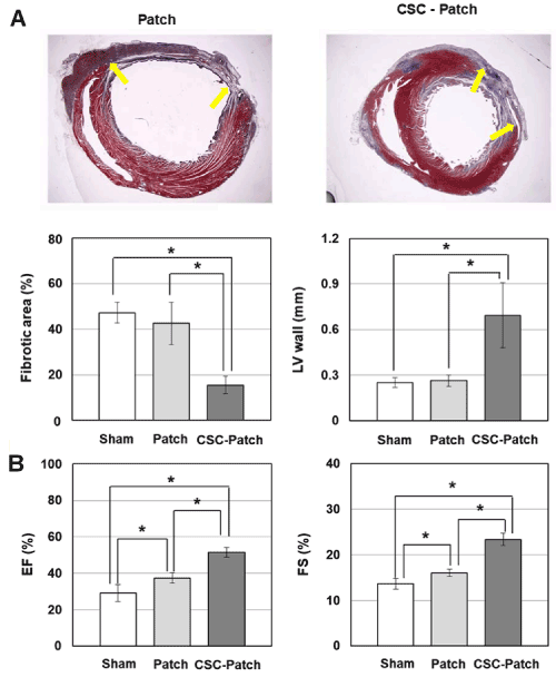 Figure 8. In vivo structural and functional improvement in infarcted heart after implantation of CSCs via the 3-D mat. Fibrotic area, Left ventrical (LV) wall thickness, ejection fraction (EF), and fractional shortening (FS) were compared between the sham operation group, patch-implanted group (Patch), and CSC-seeded patch implanted group (CSC-Patch). (A) Representative microphotographs of heart sections. Wall thickness and fibrous area of the left ventricle (LV) assessed by histomorphometric method (Masson’s trichrome staining) after 4 weeks of myocardial infarction. CSC-Patch group shows significantly reduced fibrotic area and increased wall thickness of LV. Yellow arrows indicate fibrotic areas. (B) Global cardiac function assessed by echocardiography after 4 weeks of myocardial infarction. Echocardiographic examination showed functional improvement in CSC-Patch group. (*, p<0.05 compared to sham or Patch only group.)