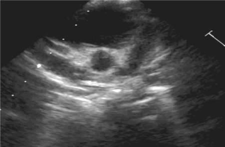 Figure 2. Parasternal short-axis view at the level of the aortic root demonstrating a proximal right coronary artery (RCA) aneurysmally dilated
