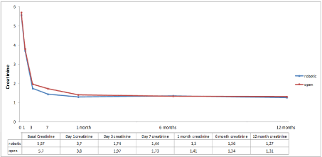 As regards to functional results (delayed graft function, acute rejection rates and overall graft survival), we did not find any differences, although the surgical time in the robotic group was longer. Oberholzer, et al. [14] found a higher creatinine value at discharge in the robotic approach (2mg/dl vs. 1.2 mg/dl; p=0.04) but with a similar graft function after six month follow up with 100% graft survival at 3 years. The previous published series had similar levels of creatinine during follow up [2]. Creatinine evolution in our series was equivalent in both groups.