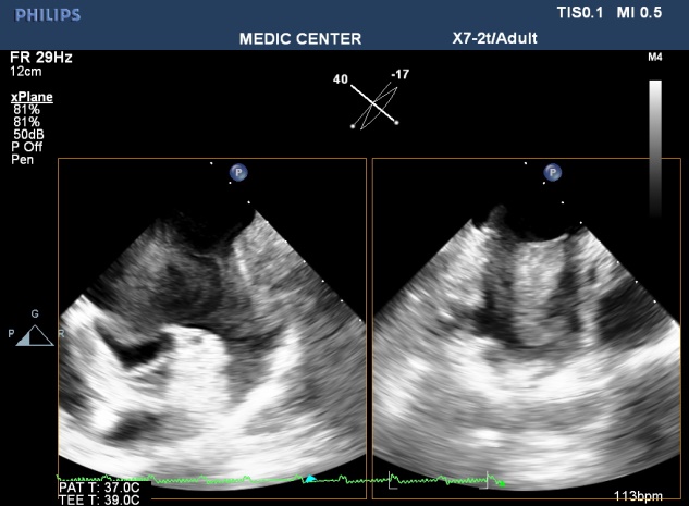 Previously, Toshiba SSH 140 A with TEE biplan probe have been used to perform 2D TEE in our hospital. Since October 2010, transesophageal echocardiographies are made by X-MATRIX, iE 33 Philips machine.