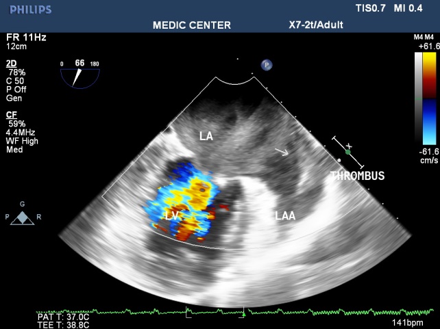Assessment of consequences on the LA and LAA ( study LA volume, LAA thrombi ) using X-plan function and 3D Zoom should be preferred because it is accurate and strongly related to predicting thromboembolic events and detecting thrombi [15]. Thrombi in LA and LAA were recorded on 24 patients with AF and 4 patient with sinus rhythm in our study results.