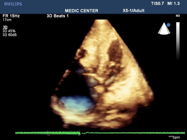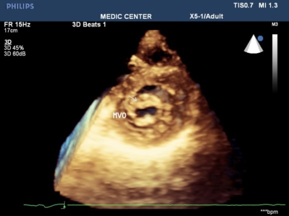 Figure 11. 3DTTE Full volume demonstrating the restrited orifice with commissural fusion and LA thrombus