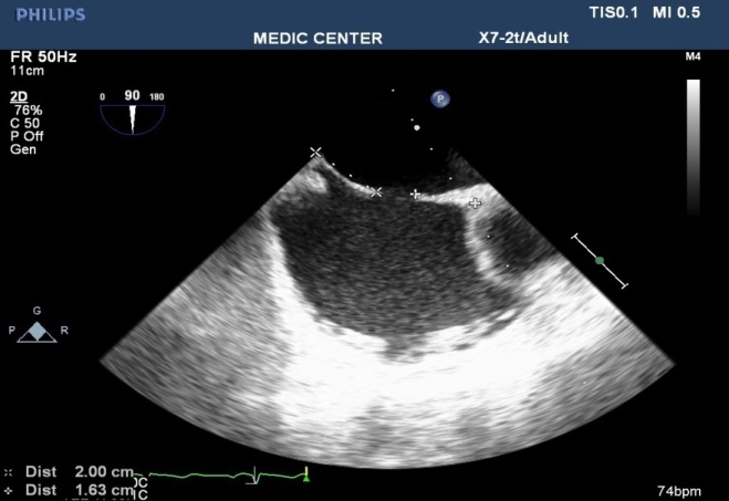 Figure 9. MS with spontaneous contrast and thrombus in LA& LAA, 2DTEE plane of 60°